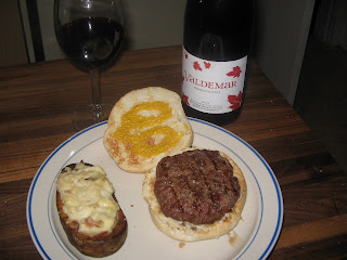 I also added something to the burger recipe...cheese. I added the slices with about three minutes left on the grill. That turned out well. They were perfectly melted. To sum up, I'm glad I went with the basic burger recipe. I need more practice at burgers. I like mine firm and crispy on the outside (not burnt, but well cooked) and medium on the inside. More experience is necessary (and non-dead coals). As mentioned before, the potatoes were good. Not great, but good. I did goof up, though. I was supposed to only use half of the cheese in the stuffing, and place the other half on top of the potatoes on the grill. This will also have to be attempted again. I made a note in the cookbook to split the cheese into two bowls during my mise en place. In other news, I went with a new Tempranillo from the Rioja region of Spain. It is six bucks, and a terrific value. Otherwise, a good beer would suffice.