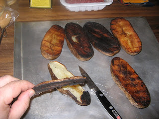 Using a simple paring knife, It was easy to trim the burnt layer. In fact, they pretty much peeled off on their own. So I used my melon baller to extract the inside of the potatoes and followed the recipe to create the filling (making a mistake in the process that I will discuss later). I filled the potatoes, formed and seasoned the patties, and was ready.