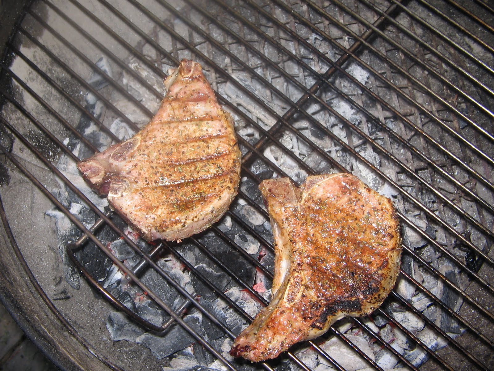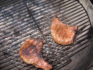 Okay, on to the main event...The pork chops have been rubbed and rested at room temperature, and The Forge is at the ready. The following two pictures are, respectively, after the first flip while searing them over direct high heat, and then after being moved to the indirect heat side.