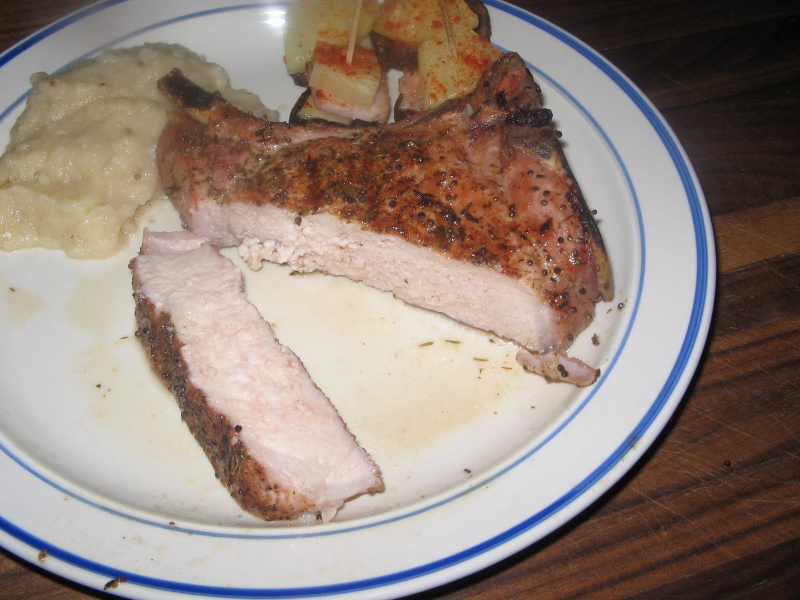 For some of the finer details: I had this meal with some of the leftover applejuice and some glasses of ice water. Were I not on a diet and in the need to pair a wine with this, I would stick to southern France in order to match the herbs. Domaine Pellehaute from Gasgogne for about seven bucks would be an excellent choice. Otherwise, a nice Spanish Albarino would pair nicely. This is a recipe that is a keeper, and from reading the other recipes for pork chops follows the same grilling technique as the others, so I am confident that they should work out well when their times come. The pork chops were completely cooked, but still rather juicy. Another two recipes completed, and another two successes. I like this book.