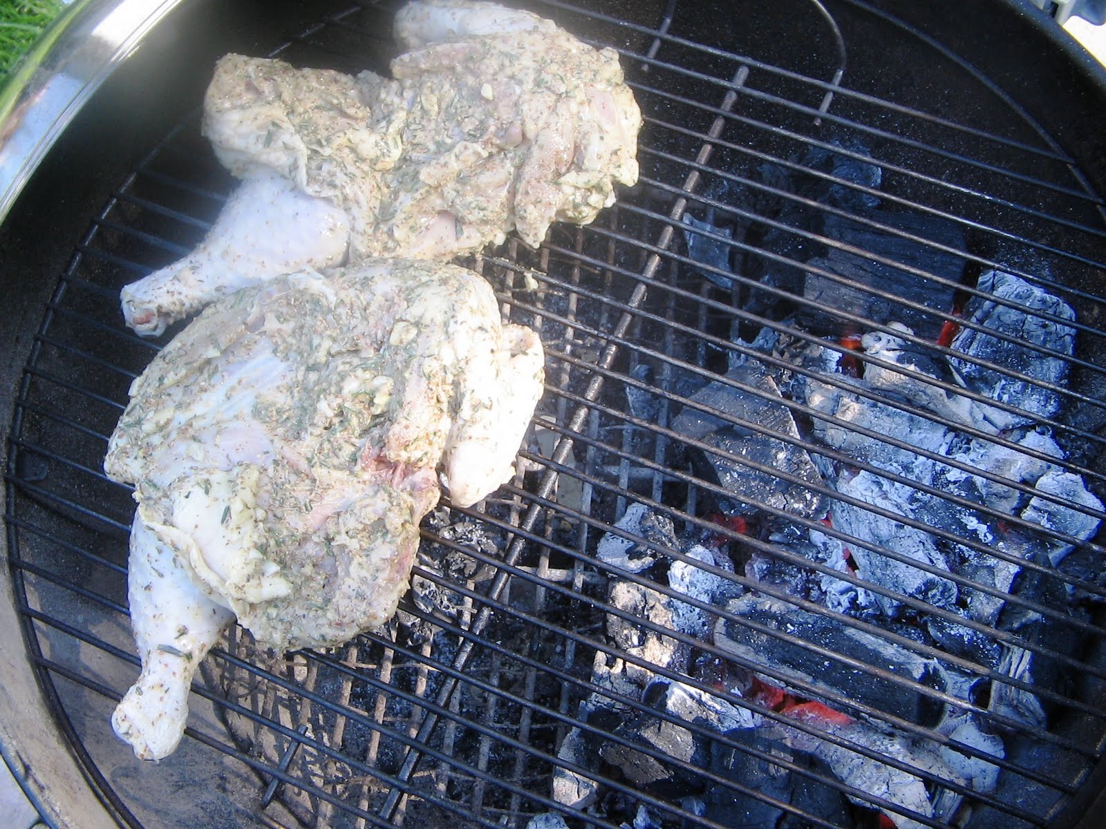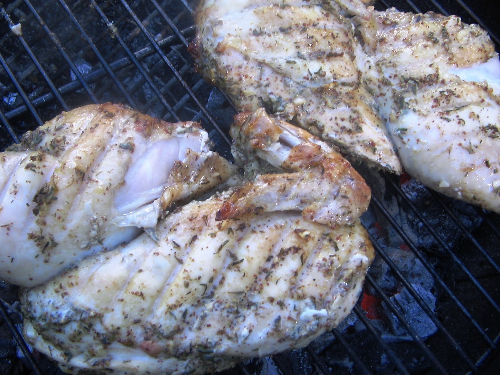 Since I don't reveal exact recipes (don't know how Weber would feel about this) I will only tell you that the marinade has garlic, whole grain mustard, thyme, rosemary, white pepper, lemon juice, and olive oil. The only substitution I made was using dried thyme for fresh, as the grocery store was out and my thyme plant in my garden is still too small.