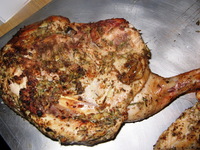 The Bride is out of town...time to start playing! I can (tentatively) grill for the next six days in a row! I have the first couple of days mapped out, and tonight it would be something that I have been wanting to try for quite some time. I've seen this done on several cooking shows, and now it was my turn...for Chicken Under Bricks on page 234. I actually started this last night before bed when I prepped the bird and marinade. Unfortunately, I forgot my camera at school, so I only have the picture of what I took out of the fridge when I got home from school today.
