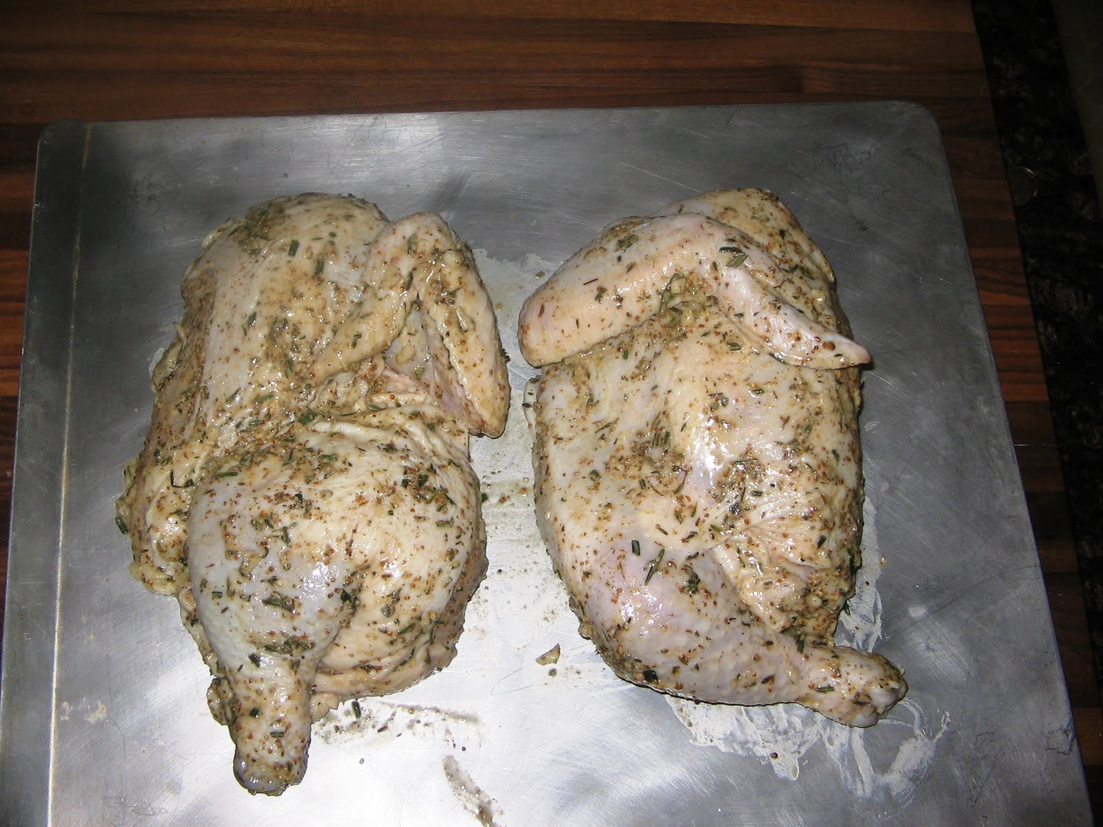 First, I applied the chicken halves skin side down: