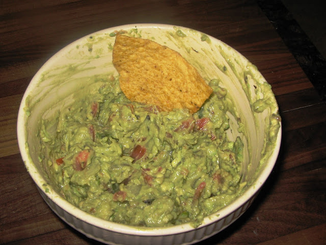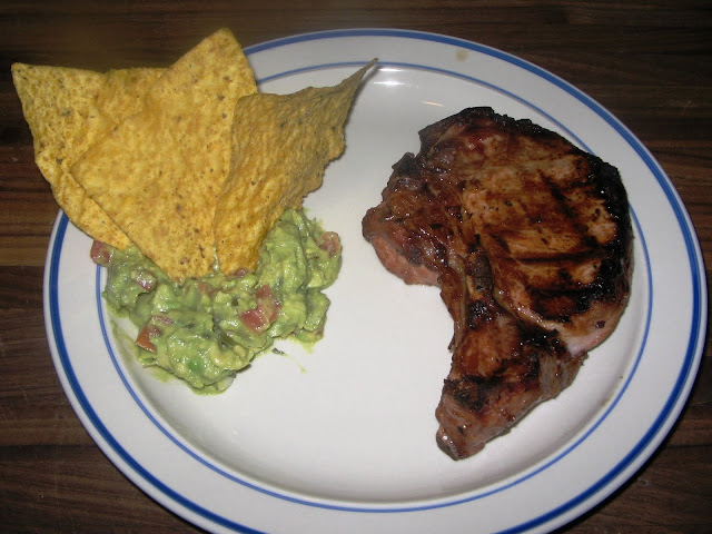 The pork chops were good, but not something I would make again. The lemon and soy sauce combination was different, good, but not something I want to keep in my wheelhouse. Notice, however, the two directions of grillmarks? Yup, turning and flipping ARE different. It seems silly, but again, I'm new to this grilling game. The guacamole, however, is definitely a keeper. What I really like about the fire-roasted vegetables is that the onions carmalize, giving the dip a nice subtle sweet flavor that displays great depth. This is refreshing, filling, and not easy to put down. Next time I might even use fresh cilantro. :) Friends of mine will see this guacamole reappear!