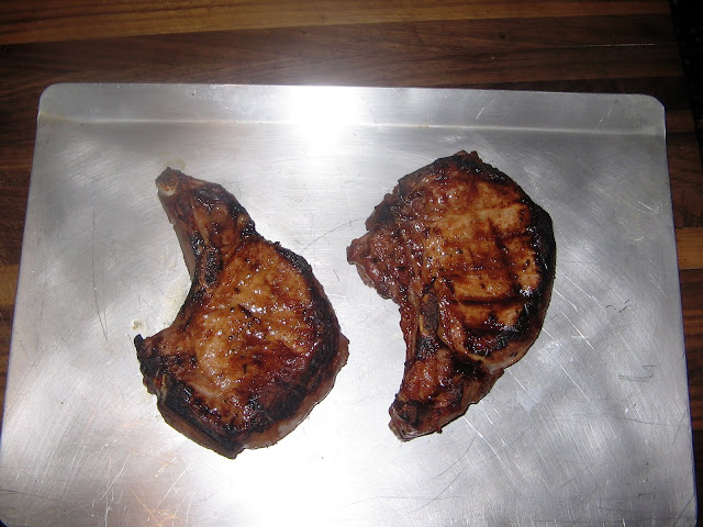 Awesome stuff! I kept eating it while the chops were on the grill. More on that later. I learned something valuable while reading The Guide. The book makes a clear distinction between flipping and turning. Thus far, when I read directions that stated to cook for x number of minutes, turning halfway through, I was flipping instead of rotating the meat ninety degrees. As a teacher I can only make fun of myself for not reading directions. Tangent aside, the chops looked great coming off the grill.