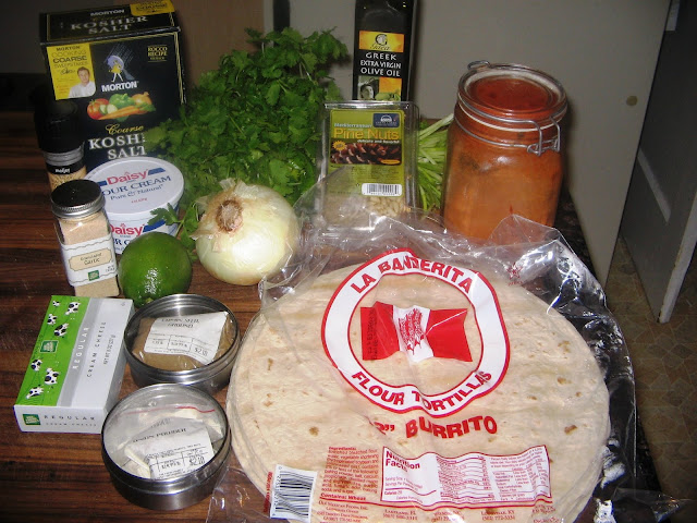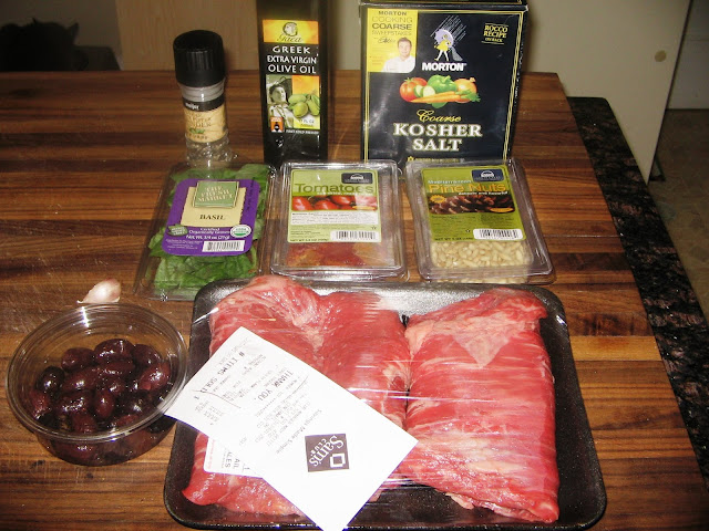 Tonight was my Friday night without The Bride. I was fortunate to have Matt come over to keep me company and partake in my quest. Yesterday, after school, I met up with Matt and let him pick out a meal from The Guide. I stated that I preferred beef, as this was my one day this week to partake in that particular protein. He had no issue with this. After some deliberation, he selected Spiral Steaks with Pesto, Olives, and Tomatoes on page 115. I agreed, and personally picked out the Yukon Gold Potatoes and Button Mushrooms on page 343, and the Southwest Onion Dip on page 80 as an appetizer. The first thing I had to do when I got home from school on Friday was to prep the steak spirals, as I knew flank steak appreciated a long marinade.