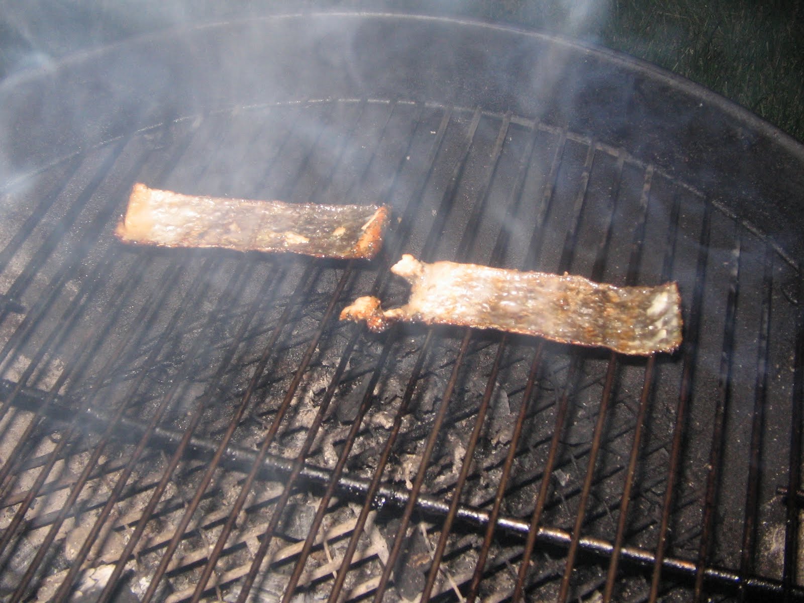 While the rub/paste did its thing, I cleaned the house for an upcoming grill session on Sunday. When dinner time approached, I made my sweet potatoes and placed them in the oven. I readied The Forge, and gently wiped the paste off of the salmon. I had already soaked the oak wood chunks, and so I placed them on the coals. When I had a good amount of smoke going, I laid on the salmon fillets and removed the sweet potatoes from the oven to cool a bit.