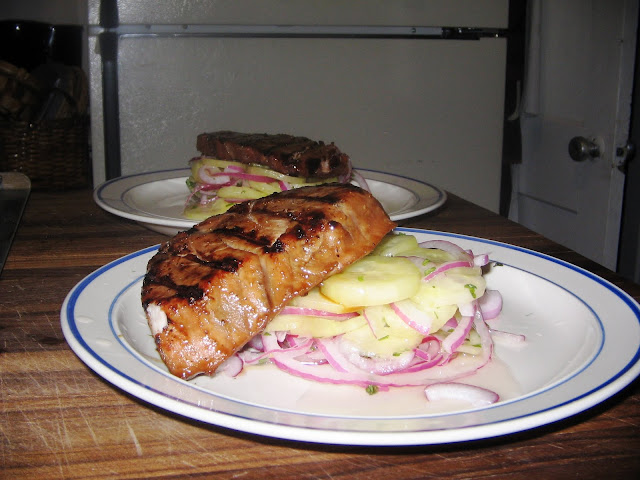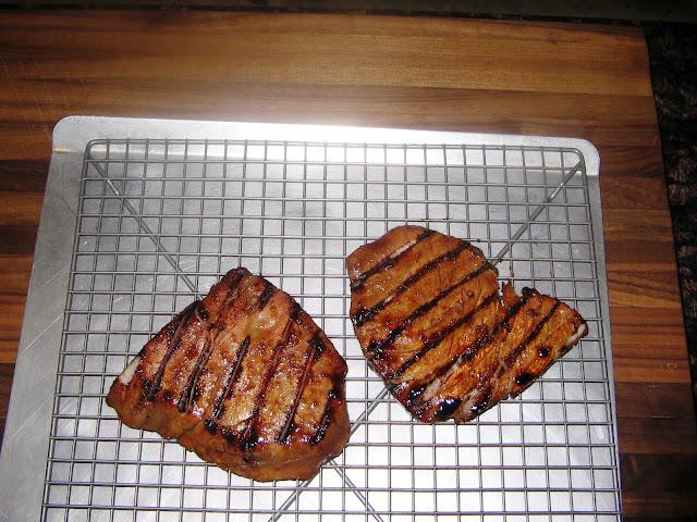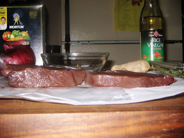 The Bride and I had decided on Honey-Soy Ahi With Crisp Cucumber Salad on page 304. I stopped by the Hyde Park Fish Market because I had always been treated so well there. I told the monger that I needed two ahi tuna steaks, six ounces each and one and a half inches thick. As he was cutting them, he told me that if I wanted them to be six ounces, he would need to cut them thinner. Not thinking too much on the matter, I responded that I was more concerned with weight than thickness. All of my other cooking experience has been more focused on weight than volume, whether it's baking, roasting, braising, stewing, etc. This would come back to bite me in the butt...more on that later.