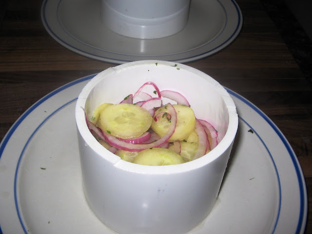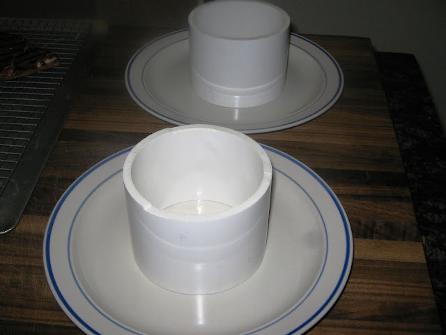 Before I show the final plating, allow me to show you a tip I picked up as far as presentation is concerned. One trick the restaurant industry uses is to go "vertical" with the presentation. They use metal rings to stack layers of food, and then make it look pretty from there. I looked into the metal rings at various stores, but they were rediculously priced. Then I read Kitchen Confidental by Anthony Bourdain where he suggested using PVC pipe. So for about five bucks I was able to make six rings. Here I am using two of them.