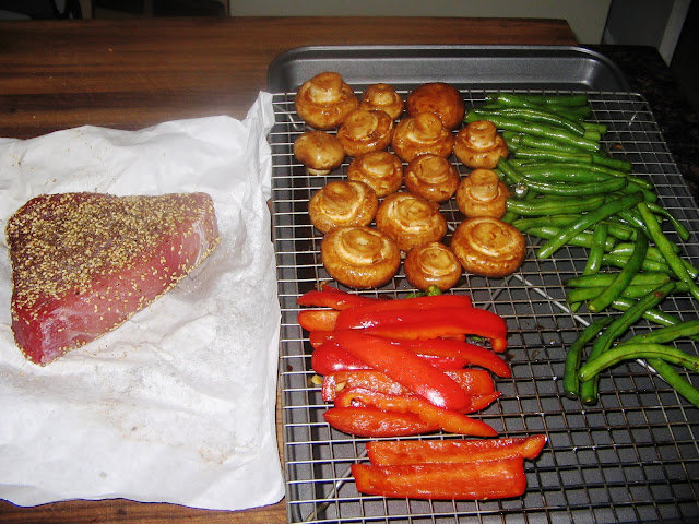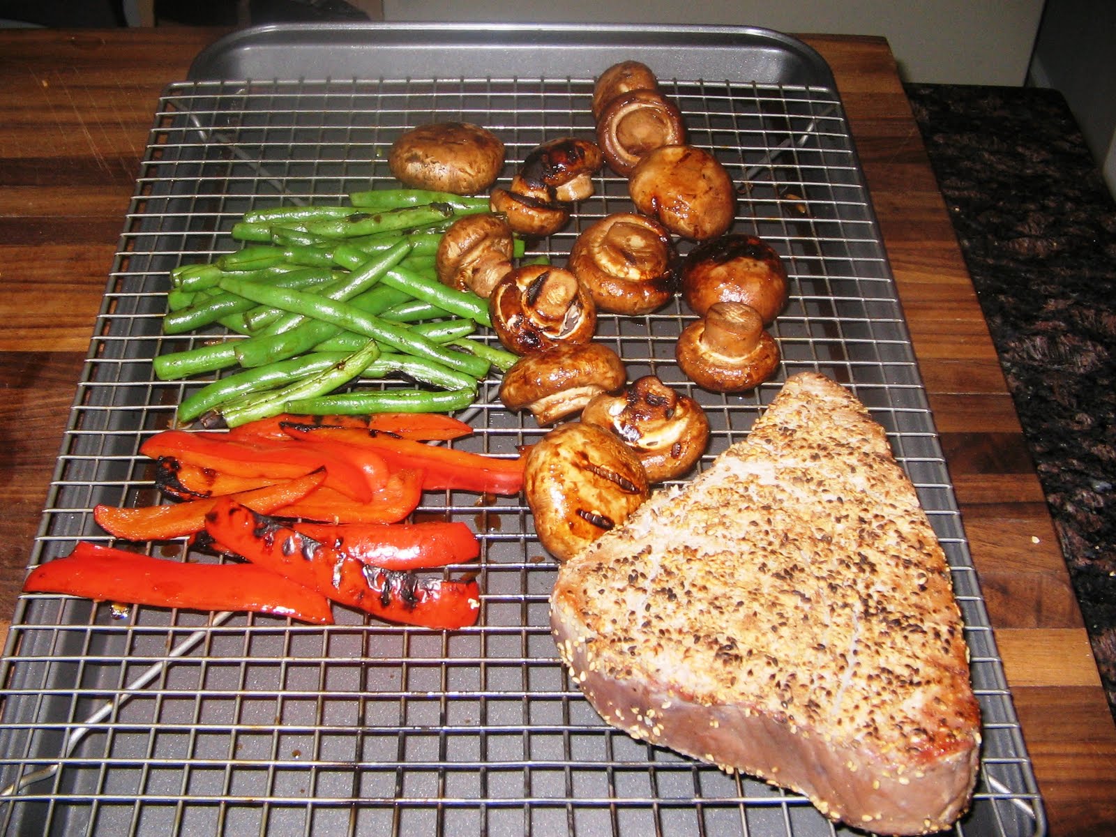 The tuna was, again, perfect. The white pepper in the rub added a hint of sweetness and a nice intensity and texture. The dipping sauce was a lot of fun - I even dipped the veggies in it even though they had a great flavor on their own - and gave a pleasant combination of saltiness, citrus, and heat. As for the veggies, the mushrooms soaked up the marinade the best, the red bell pepper tasted the best, and I didn't quite cook the green beans long enough but I think they would have been quite nice. The marinade will be used again, as will the Grilled Ahi. I still think I will tinker with the dipping sauce a little, but it is an excellent starting point.