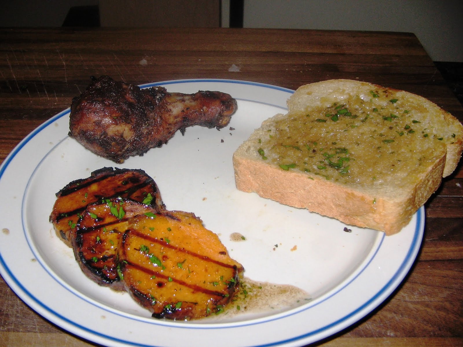 I liked this recipe because it was the first time I tried cooking a whole chicken that was cut into parts. To be honest, I would combine this recipe with the Chicken Under Bricks technique and cook it whole instead of in parts. Tonight I learned that when Weber says to cook for five to ten minutes over direct heat at the end to crisp up the skin that I should lean towards the shorter end of the time spectrum. There was a little too much carbon for my liking. Luckily, it was the paste that burned, and the chicken underneath was pust plain perfect. The sweet potatoes would have been terrific, but next time I will either cut the slices a little thinner or cook the slices a little longer. They were just barely underdone, but overall I like the recipe. It is another way to eat sweet potatoes, which previously I have never truly enjoyed. The bread in the pic is Anadama bread, which is a bread that uses molasses as the sweetener. I thought that it would go well with the whole Jamaican theme. I was in the mood to bake today, it was a bread that I had never made before, and I needed to step outside of my box. It turned out really well, and even The Bride liked it.
