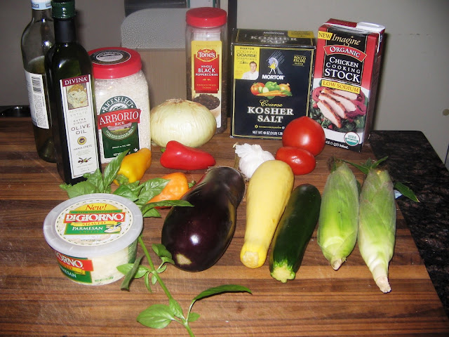 I had the day off and was eager to hit the small market shops in Findlay Market and Hyde Park Fish Market. The Bride requested a familiar dish and a risotto for the side. Risottos are great because you can add just about anything to them to for a change of pace. I even recall looking at a risotto cookbook a few years ago that contained over 150 diferent recipes. However, I knew that The Guide had a risotto so it was an easy decision to make. I shopped for the materials necessary for the Summer Vegetable Risotto on page 341.
