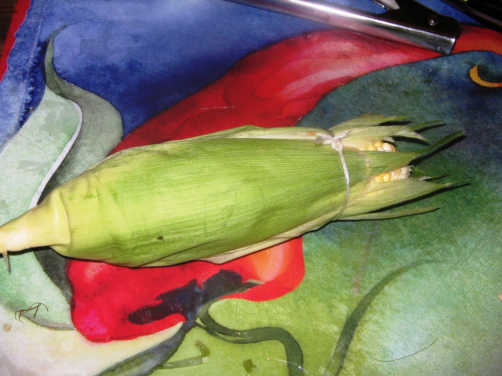The husks needed to be returned and tied up. The soaked leaves would prevent the kernels from burning during the long grill time required to properly cook the corn.