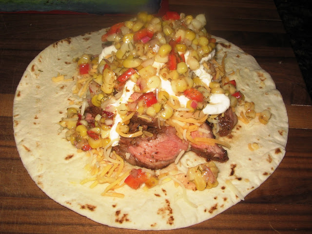 It was SO GOOD to be back in my wheelhouse. I love steak, and I love spicy. The rub, per usual for Weber, was right on. It may be a tad too hot for those unfortunate weaker souls, but was right up my alley. The corn salad complimented the steak quite well. In fact, I liked it so much that it will be making another appearance later next week. I am planning a dinner for some friends to celebrate the end of the summer, and I had been looking for a side for one of the courses. The sweetness of the corn plays well with the mustard-dill dressing, which will be a nice accompaniment for what I am planning. As I was eating this, I also came to another conclusion. This is a great recipe for quickly preparing steak fajitas! Normally I like flank steak for fajitas, but they take at least four hours of marinating to make them approachable. This was easy to chew, had great flavor, and can be done in about half an hour. The corn salad would be a nice addition to the fajita as well, so I pulled together what I had laying around the house and gave it a shot.