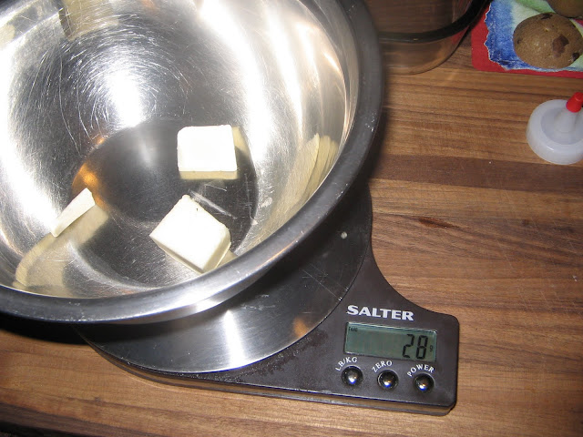 While the garlic bulb cooled to a reasonable temperature that would allow me to handle it, I gathered the other ingredients for the compound butter. For your tip of the day, I will give you an easy way to measure butter. The recipe called for two tablespoons of butter. Have you ever tried to measure cold butter? This is especially difficult if you aren't working with a stick of butter that has the tablespoon markings. I have learned from various baking experiences that the accepted mass of one tablespoon of butter is fourteen grams. As I needed two tablespoons, I used my digital scale to measure twenty-eight grams of butter.