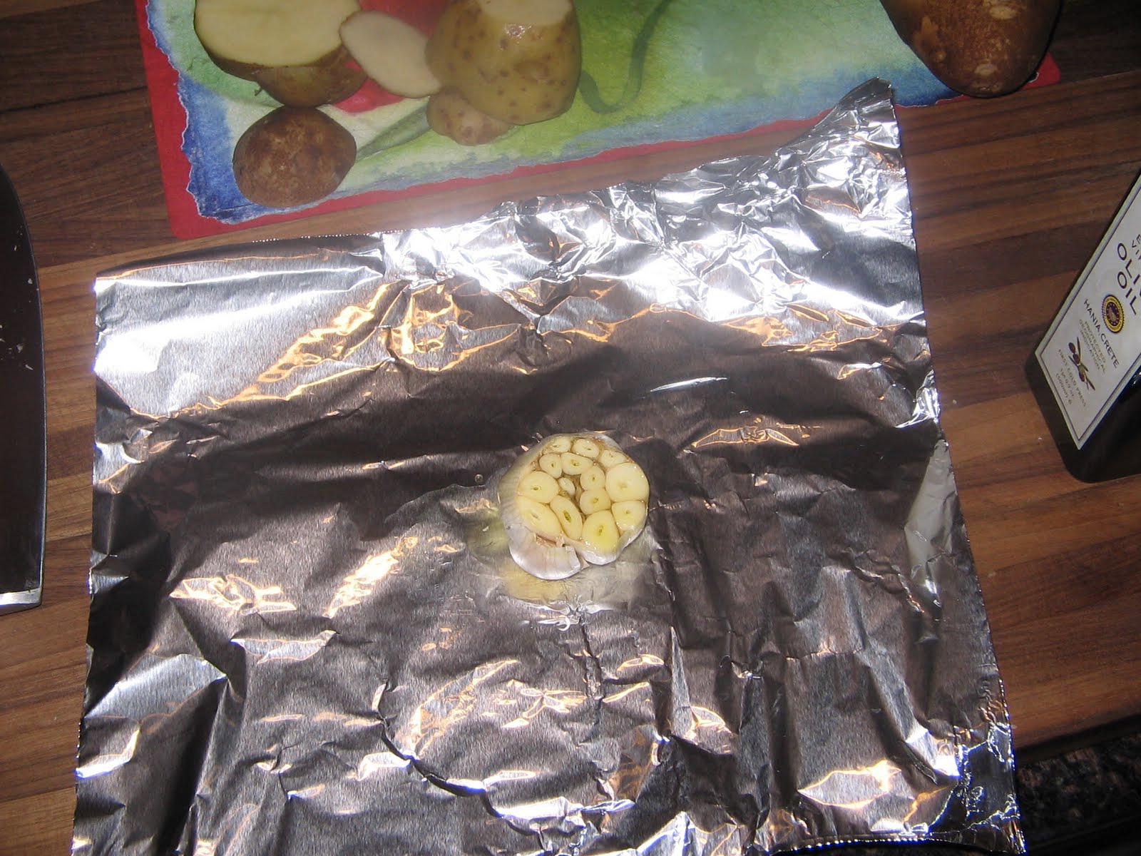 It's amusing to me that "butter" and "better" are only separated by one letter. Tonight The Bride wanted to grill out steaks, and I couldn't agree more. I needed a recipe, however, that didn't need any sort of marinade time, of which there were few remaining. Many of the steak recipes left needed four to twelve hours to accrue added flavors or tenderize, but we did our grocery shopping at 7:00 p.m. This left us with few options, so I decided to make New York Strips With Roasted Garlic Butter on page 100. In previewing the recipe, I noticed that the steaks were rather straightforward. A little salt, a little pepper, and eight to ten minutes on the grill was all that was involved. The interesting part was the garlic butter. Upon returning from the store, The Bride set about making some sort of potatoes au gratin, and I gathered what was necessary for the steaks.