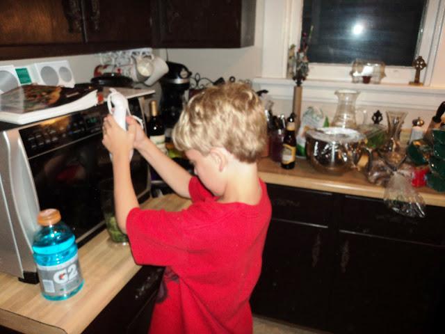 Yes, that is a rather large knife right next to him. I am always available for babysitting! The next thing Cody got to do was the use the immersion blender to make the pesto. He liked this part.