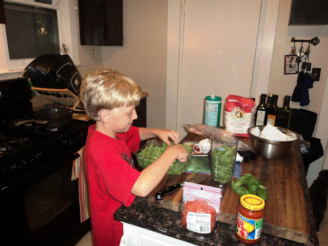 On Friday night The Bride's best friend came over, bringing along Cody, her twelve-year-old son. He wanted to make grilled pizzas, so I took the opportunity to complete my last grilled pizza recipe, the Arugula Pizza on page 337. That night was a mess, so I don't have the picture of the ingredients. Cody wanted to help, so he became my second guest chef. I took the responsibility of getting the dough started while the other three shopped for toppings. The only addition I made to the dough was a teaspoon of dried Italian herbs, just for grins and giggles. Once the shoppers came home, Cody and I set about preparing the toppings. For my pizza, I had Cody begin by measuring out the necessary ingredients for the arugula pesto that would serve as the "sauce" under the toppings.