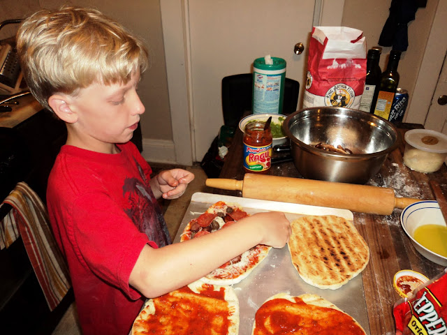 Next Cody rolled out the dough, grilled them to a nice golden brown (I'm getting the hang of grilled pizza on the Weber), and we brought them inside to begin putting on the toppings. Cody put down the pizza sauce, and then began putting on a rather ample amount of meat onto his pizza.