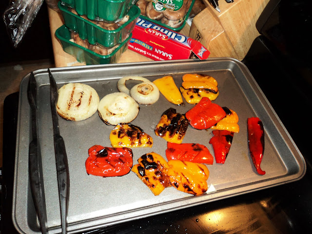 While Cody worked on cooking the Italian sausage for the other pizzas, I grilled up some veggies. Melissa (The Bride's friend) wanted bacon and onion, so I cooked the bacon and used the bacon grease on the onions instead of olive oil. My pizza needed bell peppers, so I blackened the skin on them so that the skin would peel away and the sweet pepper flesh would be revealed. Here they are, fresh off the grill: