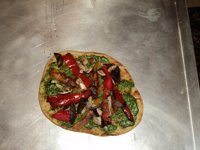 I then placed the grilled peppers and mushrooms. Then it was off to the grill with it all, and after a few minutes I was able to bring it back in and begin the second round of toppings.