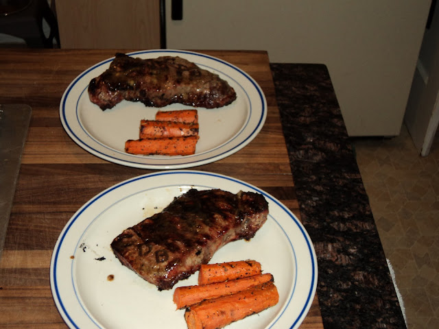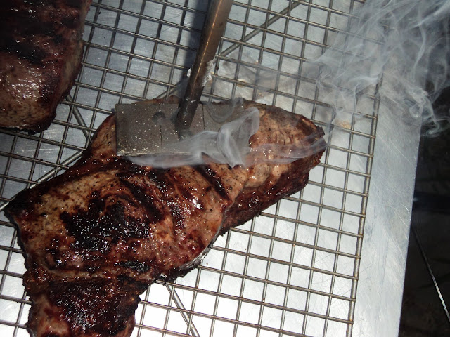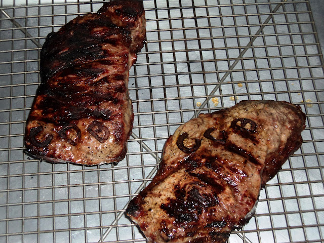 I promise to get back to posting about new recipes, but tonight The Bride wanted to use up the rest of our compound butter from the weekend. So it was back to the New York Strip Steak With Roasted Garlic Butter for us this evening. Meanwhile, I FINALLY remembered to break out my Christmas gift from my sister, Kara. I had hung it in my hallway down to my basement with some other grilling apparatus, in the hopes that I would use it as soon as possible. Long story short, I didn't because I kept forgetting. Well, nine months later, here we are, about to use my "new" branding iron!
