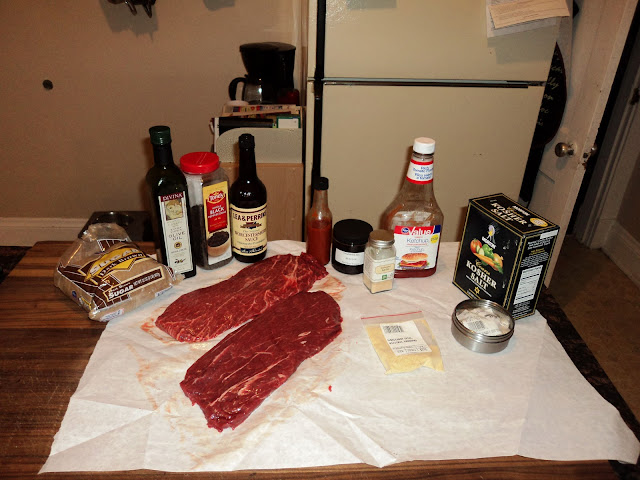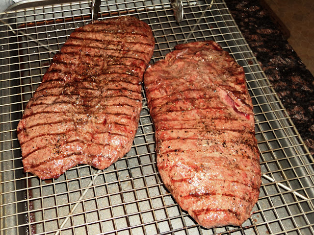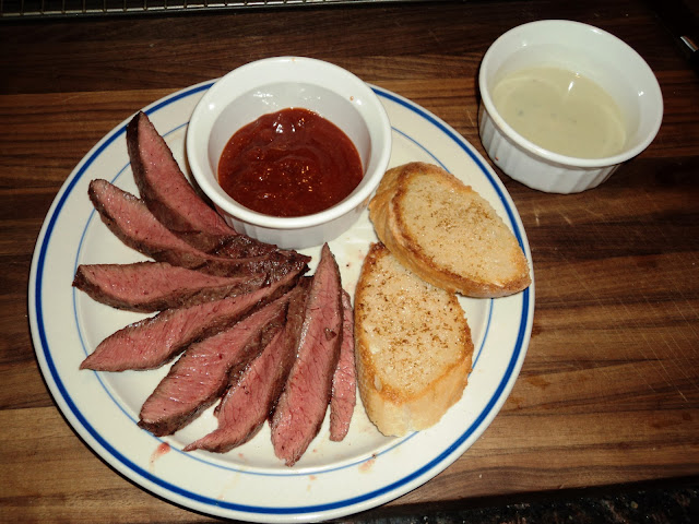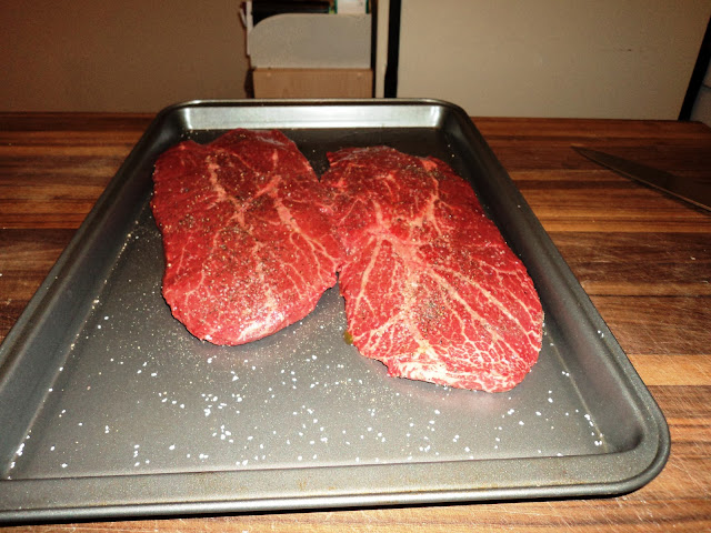So the beginning of the school year has certainly impaired my energy level and desire to cook. Quite frankly, I've been so exhausted that I've turned, in a word, lazy. Looking back at this blog, this will only be the third entry for September. Per usual, I emailed The Bride early this morning to find out what she might want for dinner. I believe the exact response was "big fat steak with blue cheese." Looking at The Guide, there wasn't a recipe that involved blue cheese and steak (although there is one for burgers that I've already done). So I went with a steak that involved a cut of meat that I've never worked with before, the Flatiron Steaks With Steakhouse Sauce on page 100. The Bride and I went down to Findlay, ate some gelato, and then picked up what we needed.