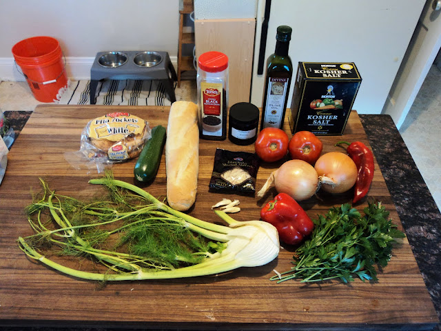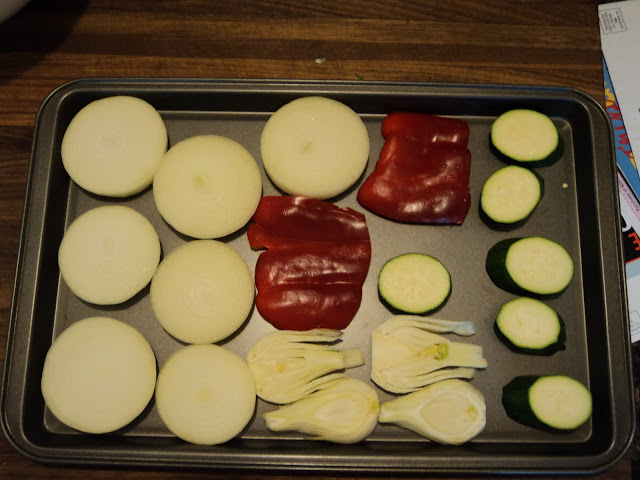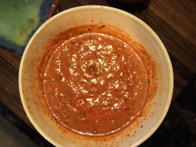 This was a nice meal to have in the middle of the week...or any day of the week for that matter. The halibut was cooked perfectly, the rub was nice, but it was the lemon-caper sauce that sealed the deal. It had a wonder briney-ness from the capers, terrific acidity from the lemon, and great texture from the parsley and sundried tomatoes. This sauce would be great on most grilled fish. It is, for lack of a better term, a keeper. As for the vegetables, the sauce continued the theme of completion. By themselves they were okay, but the romesco sauce "really tied the room together." I fully acknowledge that it is probably supposed to be served raw, but I liked it much better after it simmered for about forty-five minutes. The raw garlic flavor become much more mellow, and the tomato flavors became all the more complex. Still, though, the sauce for the fish was the hit of the night. I highly recommend it for anyone.