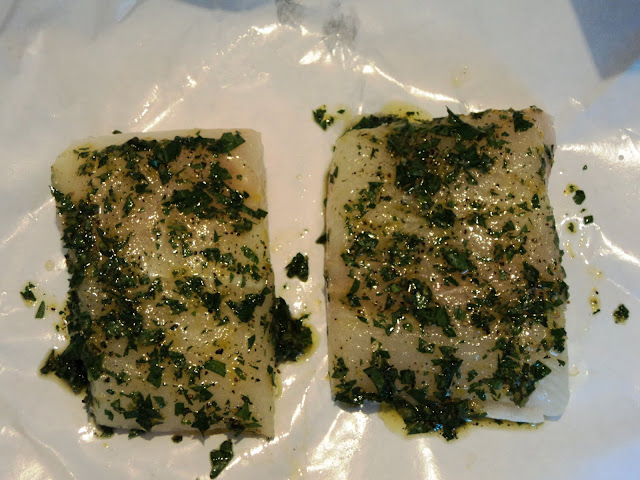 Today I received some unexpected news. For the last year and a half, I had been working under the presumption that I was going to be making graduate school payments until October of this year. This month, however, when the payment hadn't come out of my checking account, I contacted the university only to find out that I was, in fact, done with my payments as of August. Hooray! This called for a nice dinner. I emailed The Bride who indicated that she desired fish. I perused the options, then picked out the Lemon Halibut With Caper Sauce on page 306. After a quick trip to Findlay Market after school I had the necessary ingredients.