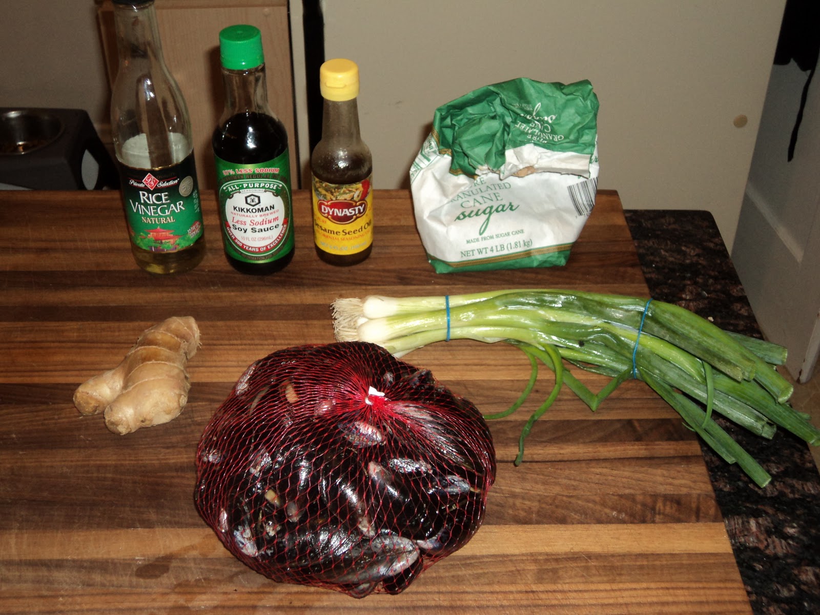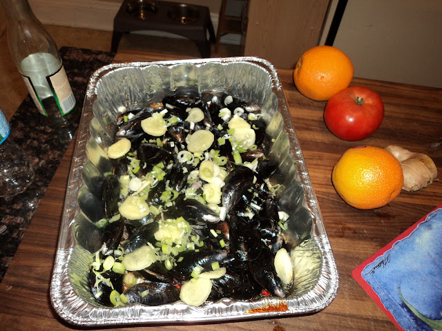 This one responded well to the "attack" and closed on its own. This one is safe. After sorting through all of the mussels, I mixed the broth (once again, I had to double the recipe) and prepped the ginger and scallions. Everything went into the aluminum pan that would go on the grill.
