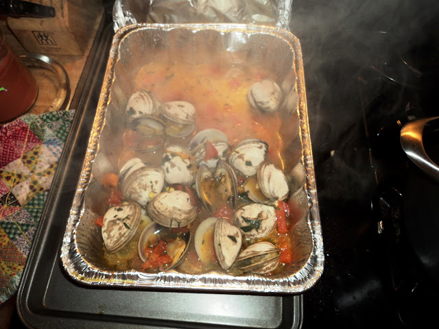 Although the recipe doesn't state it, I decided that it would be a good idea to serve this on a nice bed of linguine. I placed the noodles on the plate, picked out the clams that were done, and ladled on the sauce/broth. Some, however, did not open, and THESE SHOULD NOT BE PLATED!