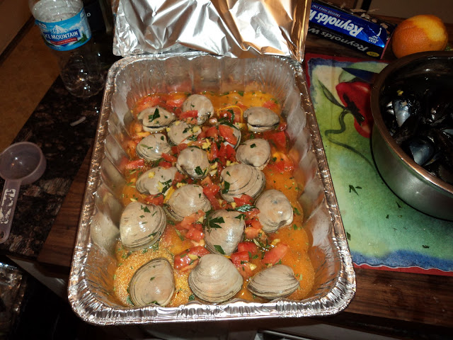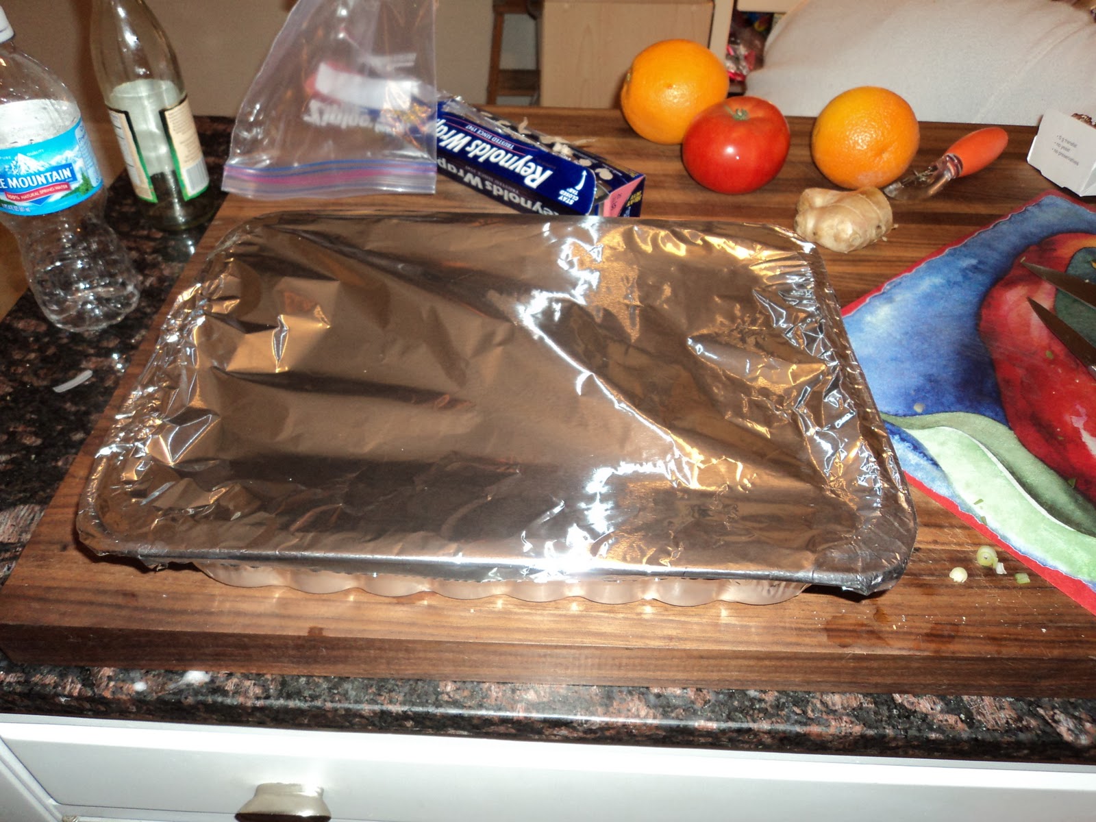 The next step was to cover it with aluminum foil. This would trap the moisture and steam the mussels with the broth.