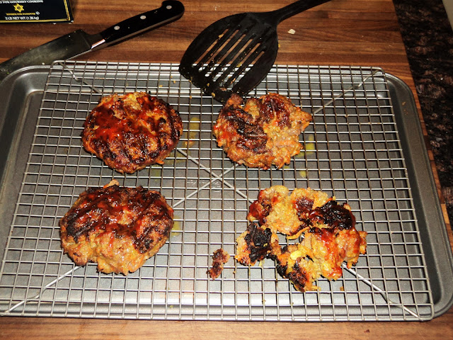 I've been calling this week The Super Overwhelming Week because I have a ridiculous amount on my plate. This was the only night that I could do any grilling until Sunday, so I tried to take advantage of that. To add to that, The Bride is in Germany for the next twelve days, so I wanted to make something that I knew she would be less than pleased with if she were here. I went with Chopped "Steaks" With Ketchup Glaze on page 97.
