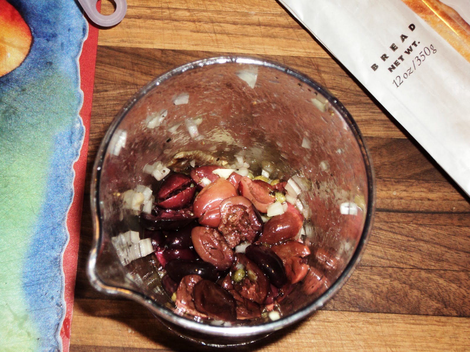 I used the immersion blender from this point to create the paste-like consistency that tapenade requires. I then cut up the bread for a quick toasting session.