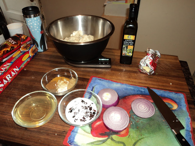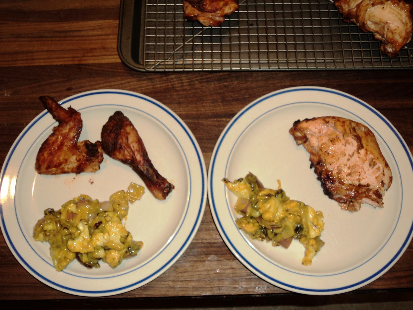 The chicken was just as good as it looks. It was juicy, slightly crispy on the outside, and well-seasoned. Even though I had given it about three hours to marinade, it needs a lot more. The recipe calls for a marinade time of six to eight hours, so in reality I only provided half that time. Still, this was amazing, and I can only imagine how good it would be after the full amount of time in the tangy sauce. It was indeed a little hint of India, and I was rather happy with it. As for the Red Onion and Cauliflower, it got a thumbs-up from me and a thumbs-down from The Bride. She said she liked the curry sauce, but that the vegetables were too al dente. I liked them that way. What I would like to have changed was the amount of sauce. I have learned to double the amounts listed in the cookbook for any marinade (I did so today as well), and I would like to have doubled this sauce. When I think of Indian food, there is always a healthy sauce to other ingredients ratio. I think this would also allow me to simmer the vegetables in order to make The Bride a little happier.