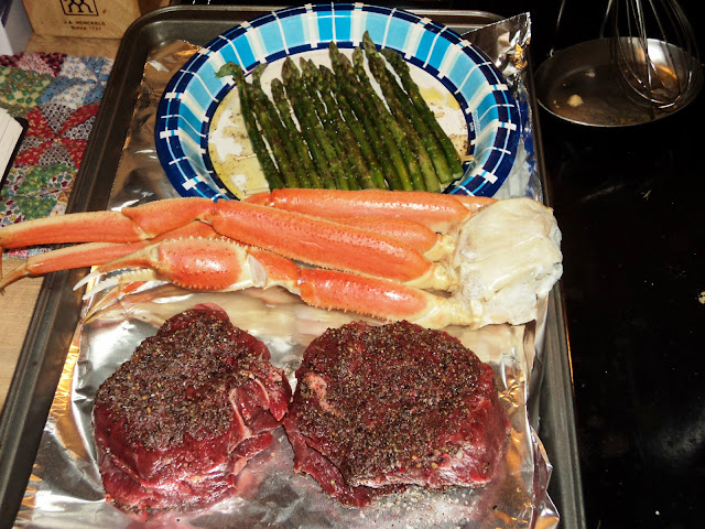 With the steaks still cooking the crab and asparagus came off the grill.