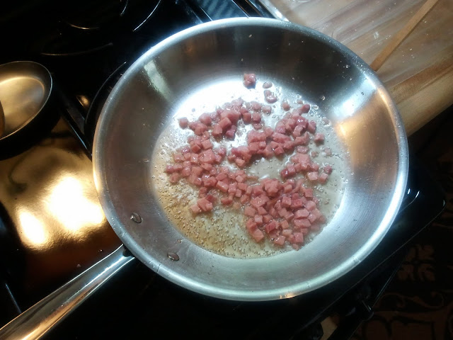 Begin the salad by sauteing the ham.