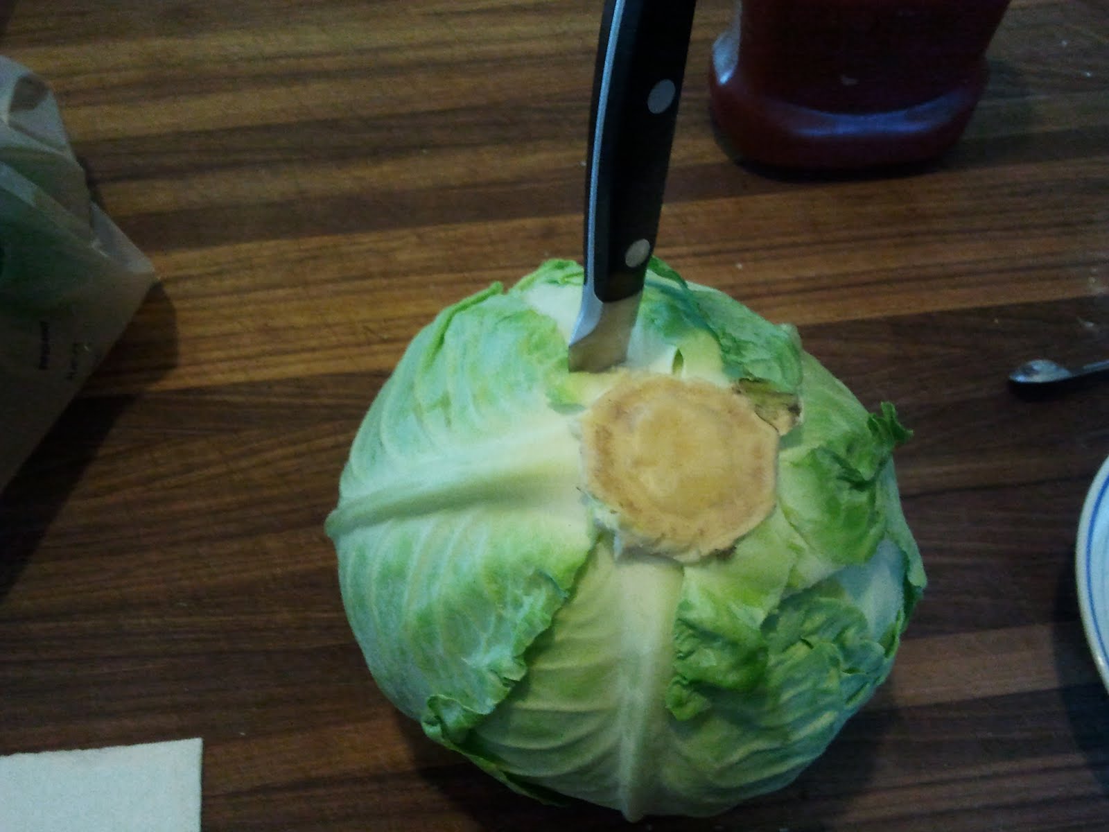 You are instructed to remove the core and leave about a three-inch cavity. I used my paring knife and began cutting into the head of cabbage like a jack-o-lantern.