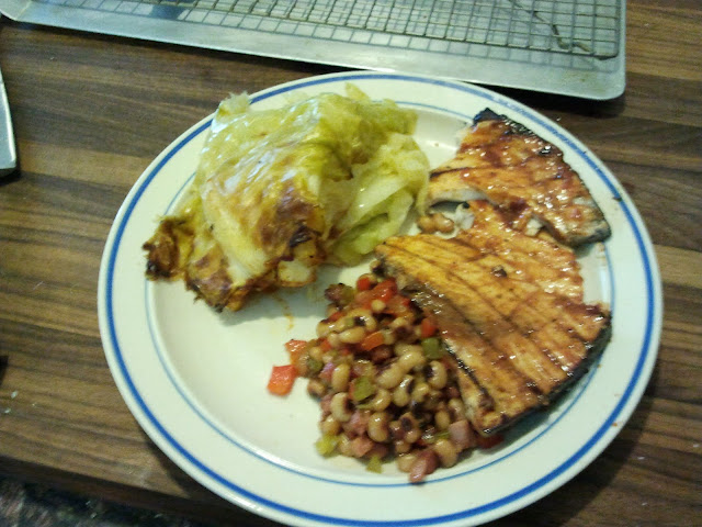 The cabbage was rather impressive. The butter sank down to all levels, and the spice mix was carried along with it. The BBQ sauce only made it halfway down, but that was okay as it allowed some contrasting flavors and variety. I'm highly interested in using this recipe in my smoker this summer. I might even cut up the cabbage into ribbons and make a cole-slaw out of it. The fish was okay...I've had better recipes from Weber using swordfish, but I would still like to try it with wahoo as the recipe intends. Finally, regarding the black-eyed pea salad: WOW! I like this a lot! Super cheap, lots of flavor, and the only change I will be making is to use bacon instead of ham. This will be seen again in the Bogdan household!