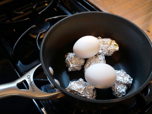 Here's the embarrassing second new technique I learned today. Here I stand, at thirty-five years of age, and I've never boiled an egg. I've fried eggs, scrambled eggs, and even made omelets, but never boiled an egg before today. I have nothing against hard-boiled eggs, in fact I've consumed them quite often. It's just that someone else has always prepared them. So I decided to do a little research in the matter. It turns out that there are QUITE conflicting approaches to something that would seem so simple.