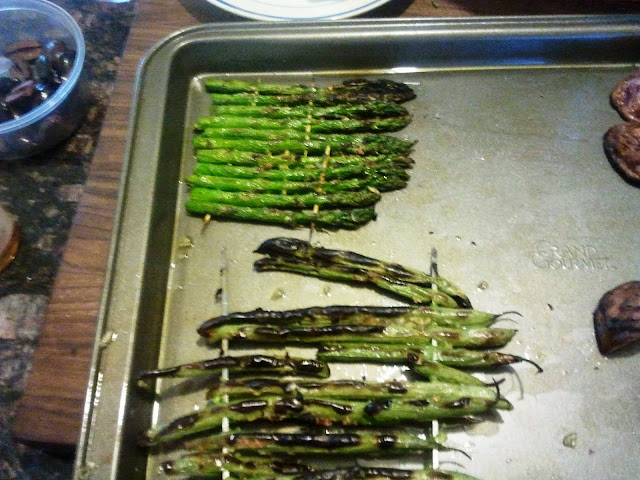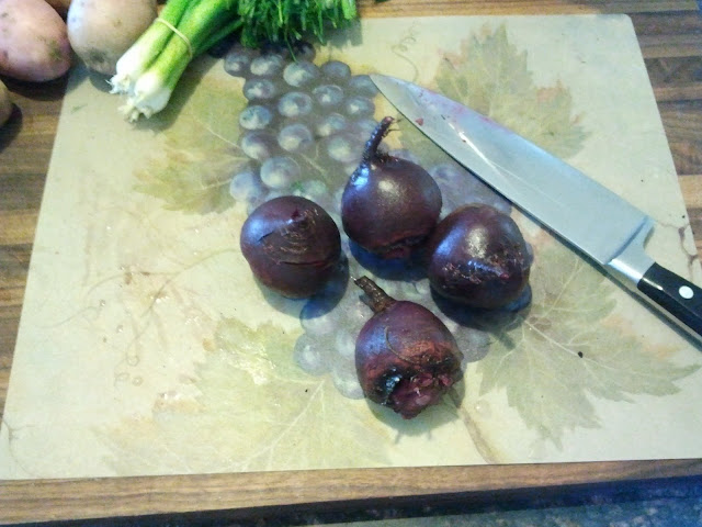 Here are the beets and potatoes, fresh from the grill. The beets are those rock-looking things on the right. So far, I wasn't excited about them. The potatoes did look nice, though.