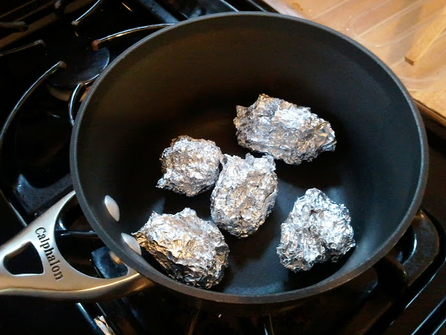 This third method I watched and decided to use did present me with a problem, though. I didn't have one of those steamer inserts for my saucepan. In the spirit of Alton Brown, however, I remembered he often uses crumpled up balls of aluminum foil as spacers. So I made a few and added them to the pan.