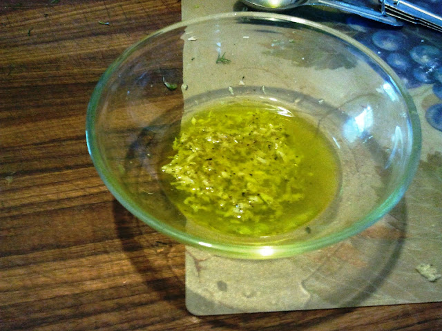 As the beets were on the grill for a long time, I could casually go about making the rest of the dish. The remaining vegetables were going to be brushed with a garlic-infused olive oil, so I made a paste out of the garlic clove, salt, and pepper. I then added this to the olive oil to for a little steeping.