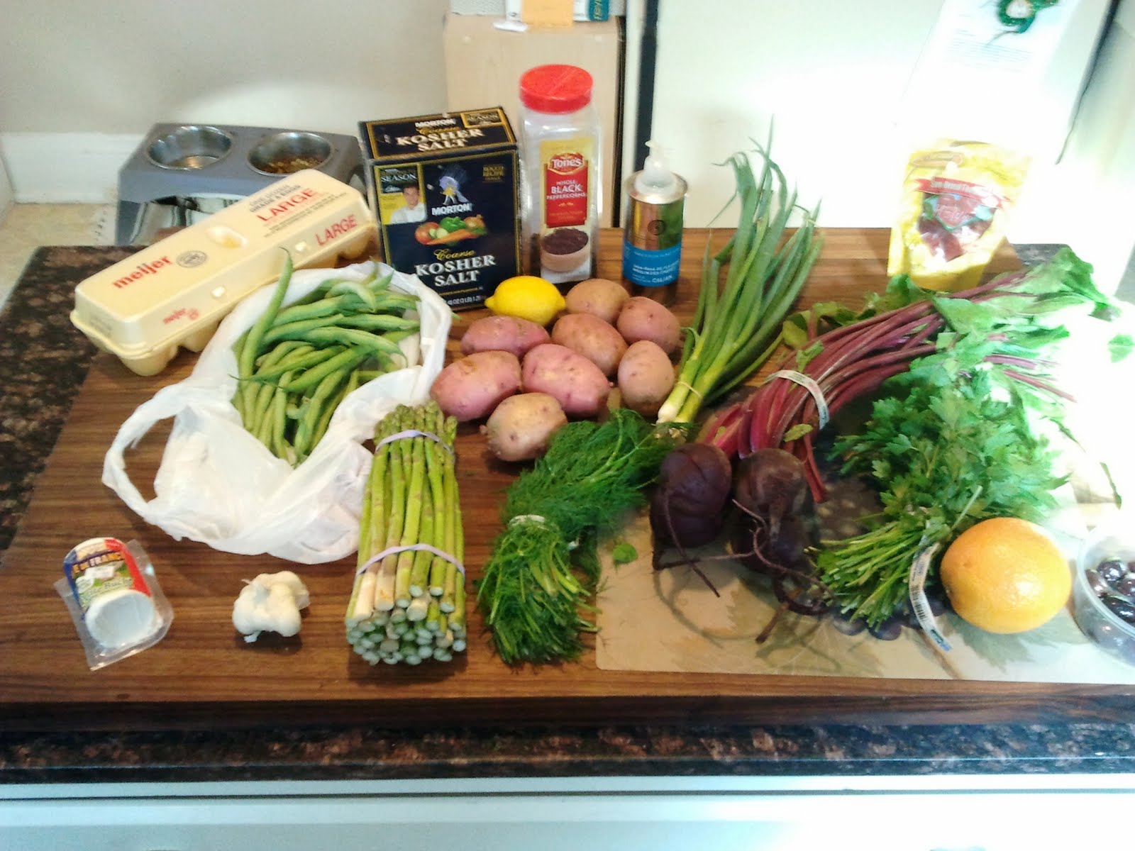All of the grilled vegetables received their turn in the dressing bowl, and then I plated. Starting on the right side of the bottom layer, we have the grilled beets, potatoes, asparagus/green beans (I mixed them together), topped by a second layer that had the eggs, olives, and goat cheese. Oh, and The Bride's favorite, the Oak Grilled Salmon was our main dish tonight. Like I said, this week she gets whatever she wants!