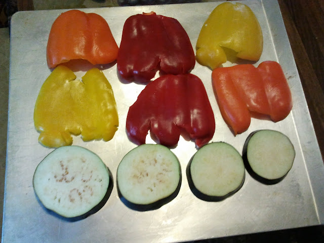 You've seen me roast garlic a couple of times now (if you're new, just go back a couple of entries, you'll find it). Otherwise, the only things that really get grilled in this recipe are the peppers and eggplant.