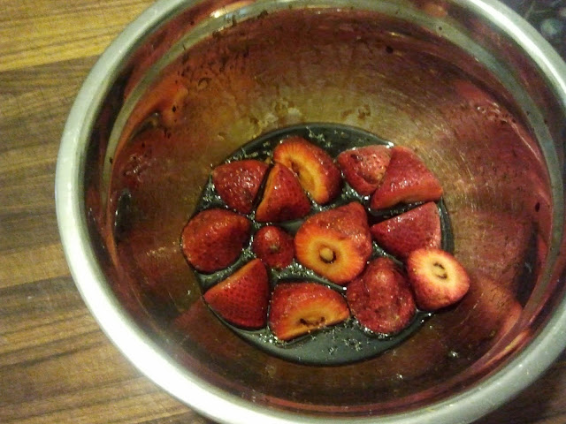 The strawberries have to macerate in the balsamic vinegar and sugar solution for about fifteen minutes. This will soften them up and add flavor.