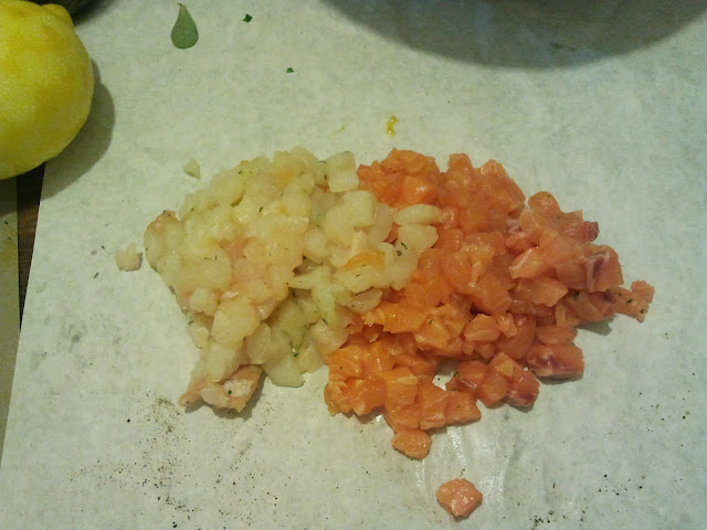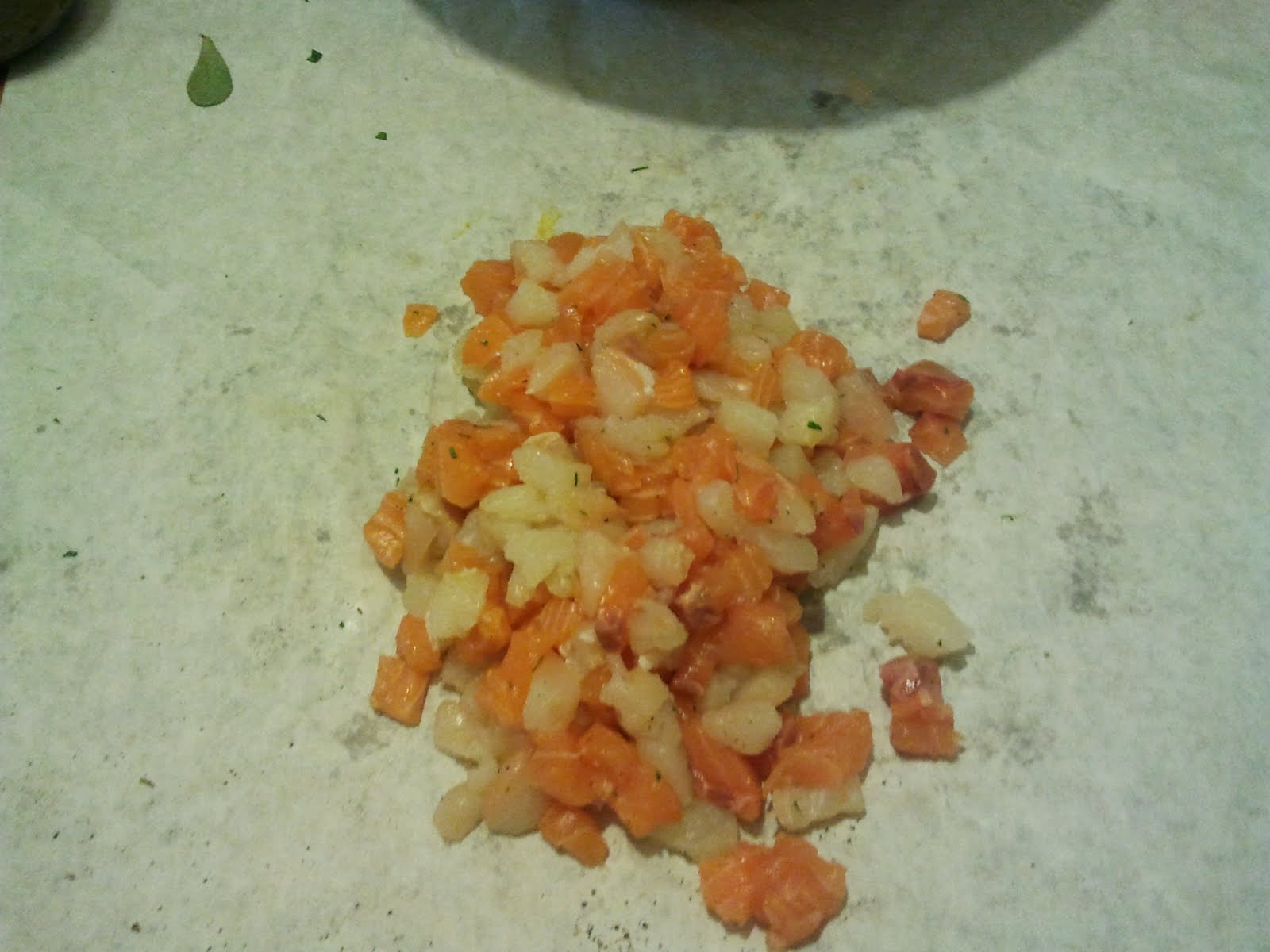 The recipe calls for you to dice up the fish, and then add them into a mixing bowl along with the other ingredients before mixing it all together. I took a slightly different path. From my experience in making crab cakes, I've learned that you don't want to overmix the fish/crab, as they can be delicate. So I began by adding all of the non-fish ingredients to the bowl first, so that I could mix them together for even distribution BEFORE I added the fish bits. This way I can avoid destroying the fish as I try to mix everything together.