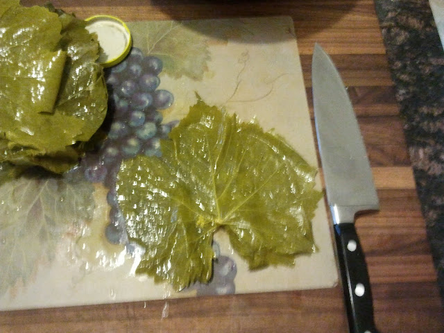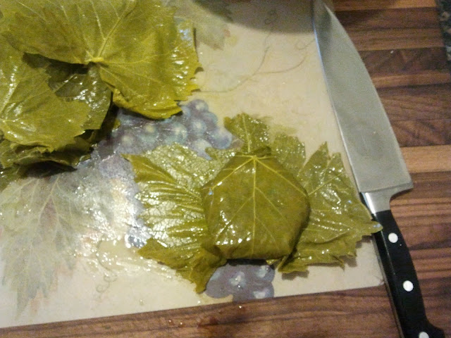 Ever worked with grape leaves? I sure hadn't. I wasn't even sure where to BUY grape leaves. Then I remembered that Findlay Market has a specialty store that deals specifically with Mediterranean Imports. I figured that if they didn't have it, I didn't know who would. Turns out that they did, but the grapes leaves were "imported" from California. :)