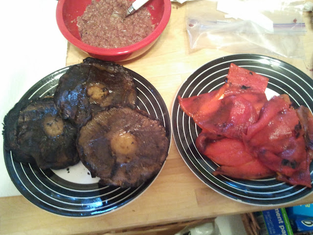 Today is a landmark event for this blog. For the first time I am conducting a grill session outside the comfort of my own home (which was an adventure in an of its own). I am at my parents' house in the Washington, D.C. area for my nephew's baptism, and The Bride and I wanted to cook dinner for the family. We had initially decided to make a couple of lasagnas and to keep everything low-key. When we learned that one of our guests was a vegetarian, I saw an opportunity to try a vegetarian recipe from The Guide. I had been eyeballing the Portabello Burgers With Roasted Peppers on page 329 for some time, and today it seemed appropriate.
