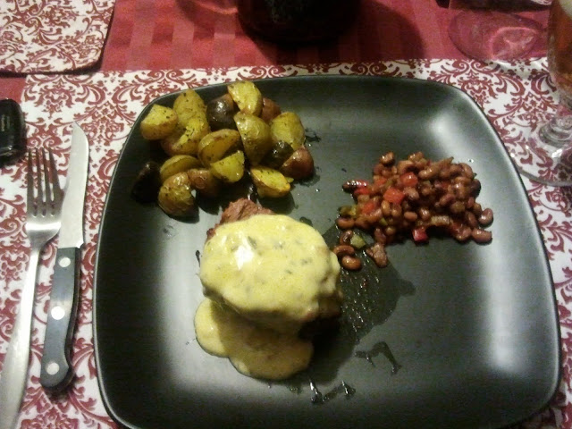 Weber also provided us with some other features in the final meal assembly. The black eyed peas were seen earlier this summer. In fact, I recently had a conversation with a friend who mentioned that she found it rather entertaining that during my write-up of that recipe that I kept talking about this salad instead of the main dish that entry and how I mentioned that it would show up again. See? It did! In another entry I learned that the filet cut tastes so good with a Bearnaise sauce, so I modified the one that Weber gave me earlier by substituting rosemary for the tarragon, as I had rosemary in the rub for the filet this evening. I figured that it might help tie the meal together. The potatoes are my own recipe from a long time ago, and are baked instead of grilled.